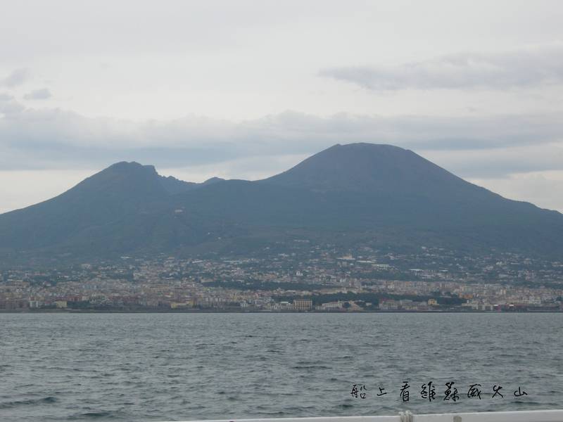 後來終於開始登船啦,坐船咩,就是要做上層可以吹風看風景的地方囉,所以我們二話不說馬上往上衝,二樓幾乎都是我們這團的人喔!一開始大家都很HIGH一直拍照,啟程後,可以遠望岸邊風光,從海上看Napoli還可以看到維蘇威火山喔!後來海風很大,越來越冷,大家就縮起來啦