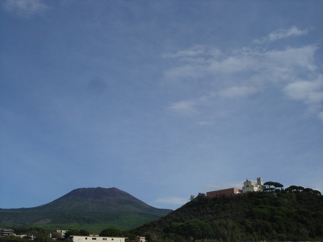 在前往龐貝古城的路上,在遊覽車上,我們已經可以遠眺到著名的維蘇威火山了!第一張圖的左邊就是維蘇威火山,右下角有在山上蓋的像是城堡的建築啦,第一次來歐洲咩,覺得很有特色,就拍下來啦,這張是老公拍的,很厲害地同時拍到了火山和小城堡啦!(右邊兩張)最後終於來到龐貝古城了,Peter幫我們買玩票後,就近去參觀啦!