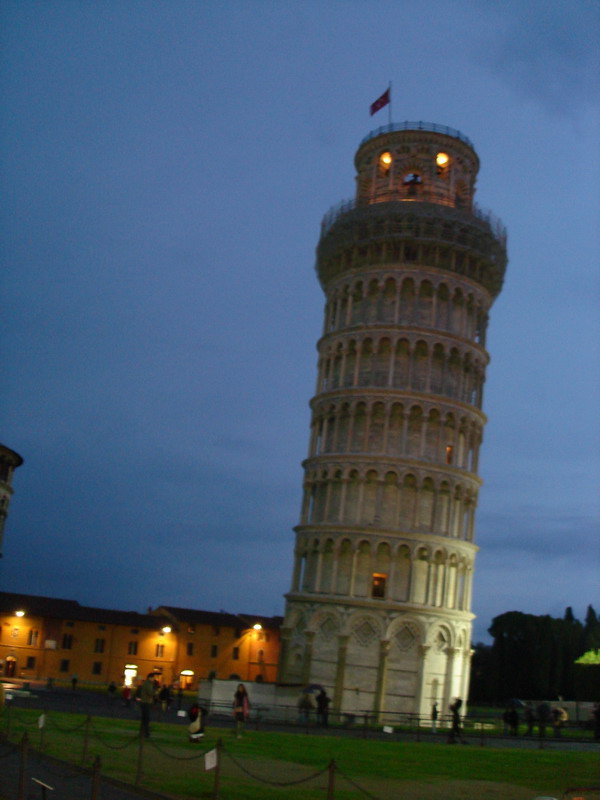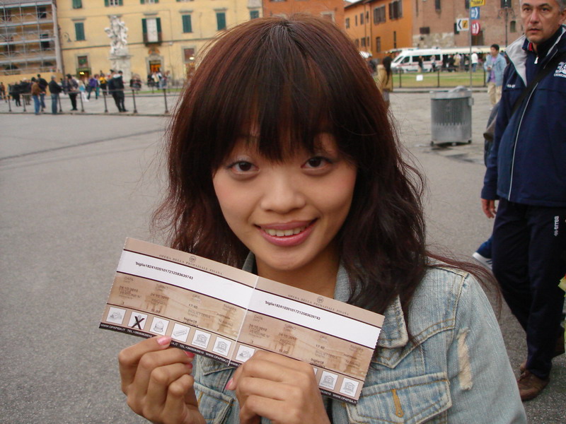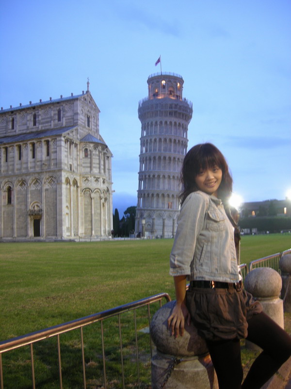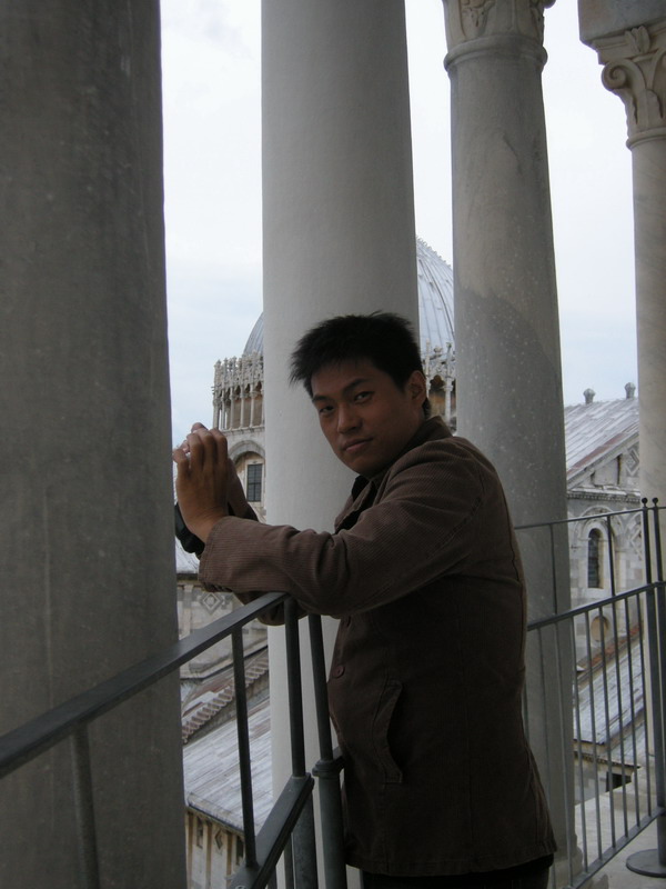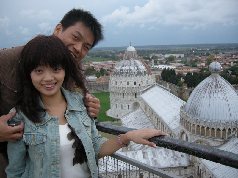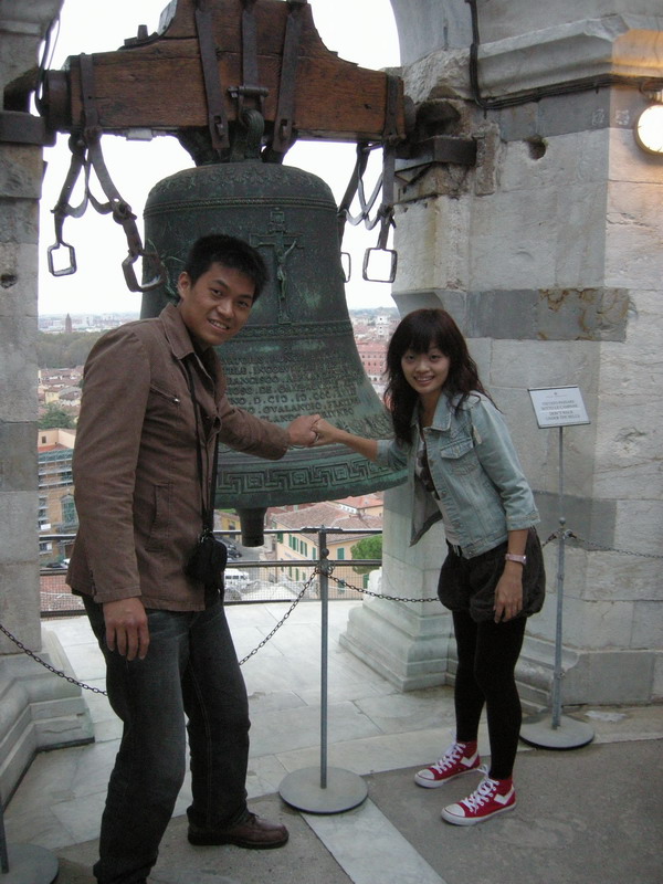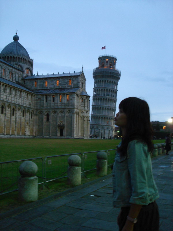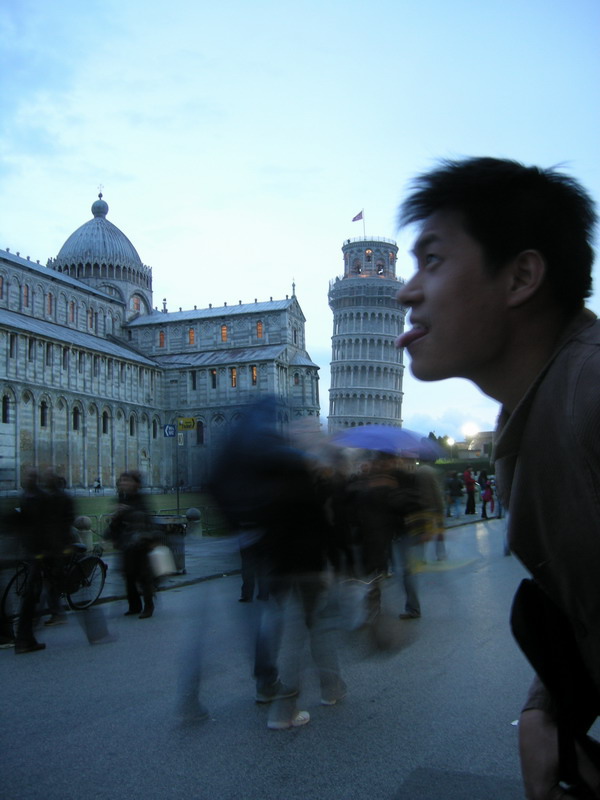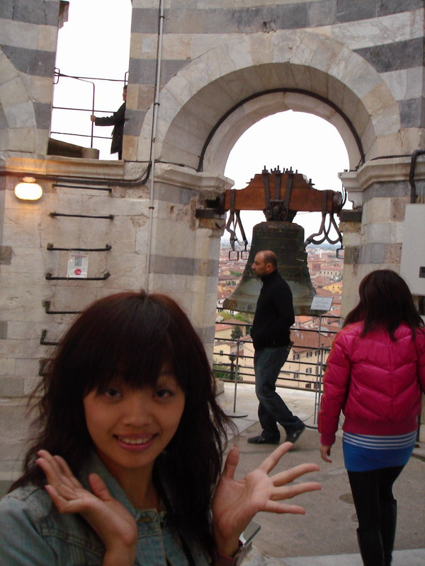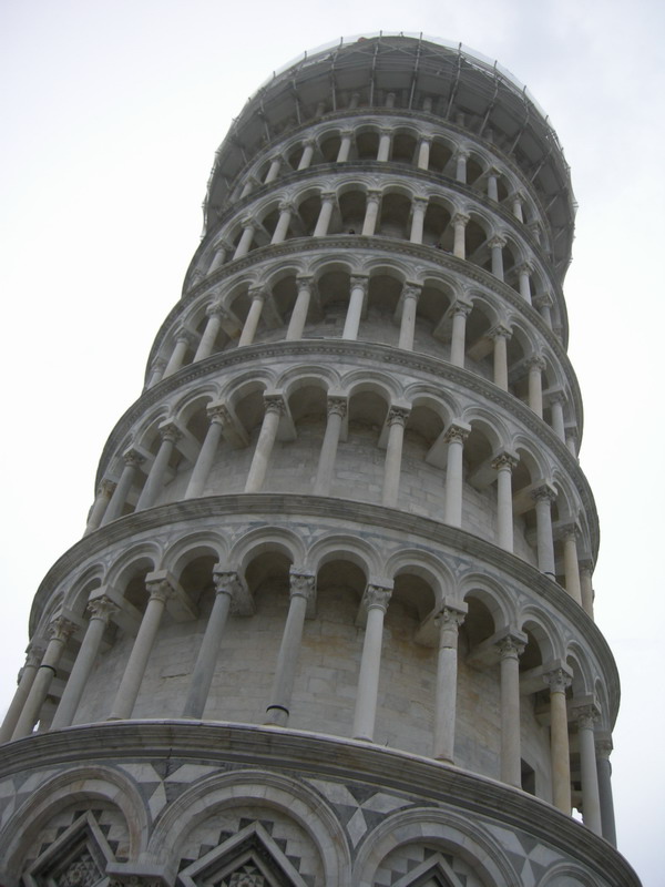 本是一座教堂鐘塔,建於西元1173年~1350年完工,中間因傾斜停工一百多年的比薩斜塔歷經三任建築師建造完成,蓋了三層後開始傾斜,領隊Peter說原本其實向北傾斜,建築師把南面的牆面加重加厚想把斜塔"扶正"沒想到拉過頭,而不斷的往南傾斜,甚至一度岌岌可危,所幸經過國際各方建築師想方設法,終於恢復到1350年完工時的斜度。