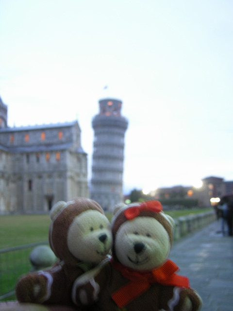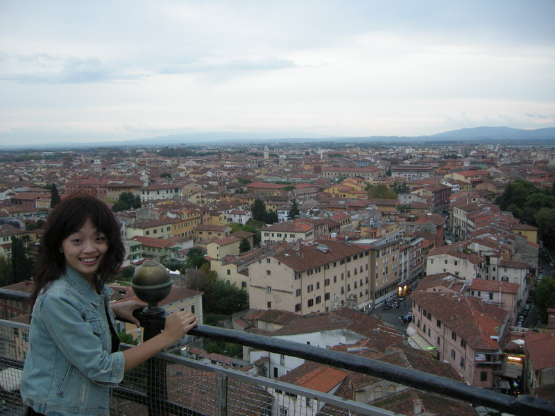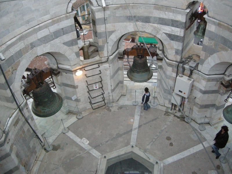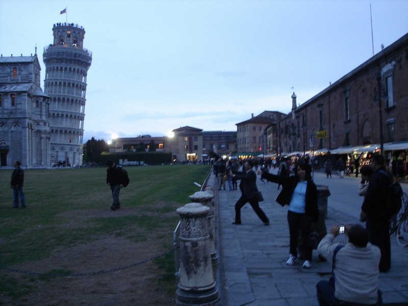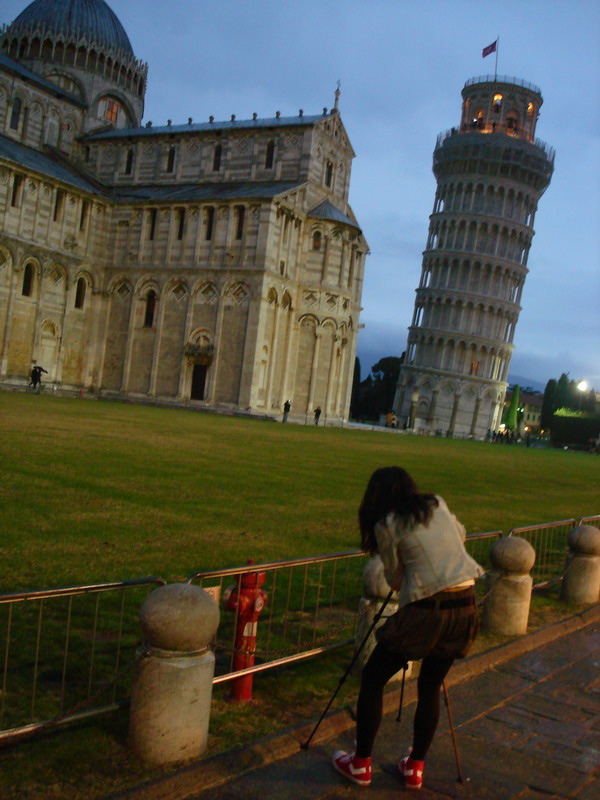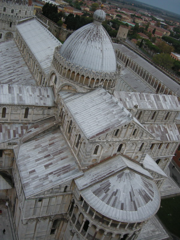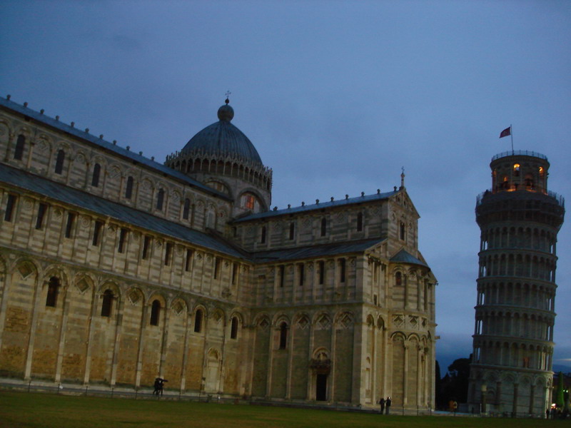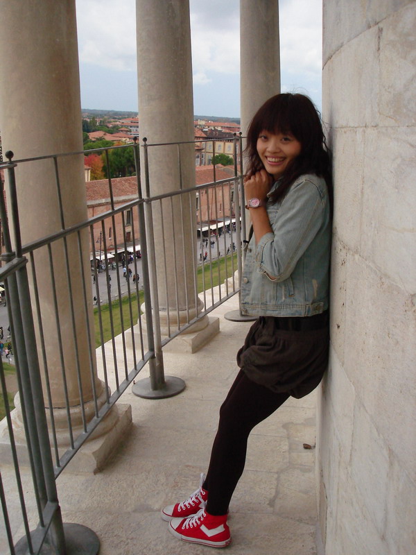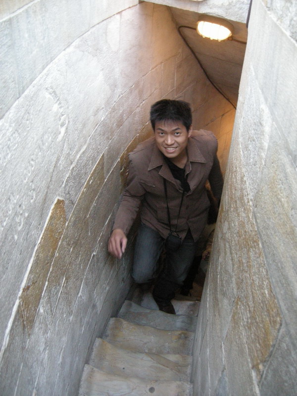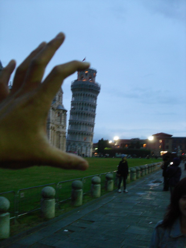 本是一座教堂鐘塔,建於西元1173年~1350年完工,中間因傾斜停工一百多年的比薩斜塔歷經三任建築師建造完成,蓋了三層後開始傾斜,領隊Peter說原本其實向北傾斜,建築師把南面的牆面加重加厚想把斜塔"扶正"沒想到拉過頭,而不斷的往南傾斜,甚至一度岌岌可危,所幸經過國際各方建築師想方設法,終於恢復到1350年完工時的斜度。