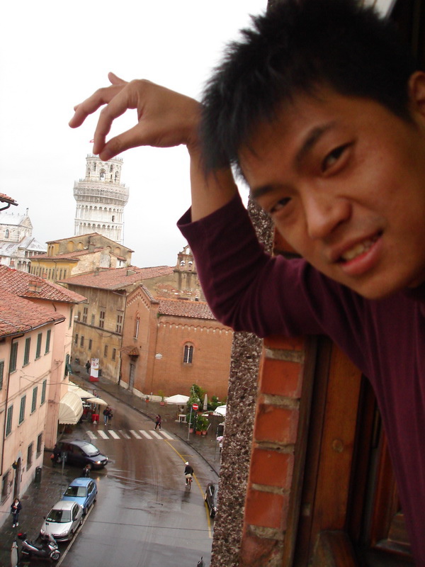 一早打開窗戶,並沒有因為窗外下雨而感到失望,反而是感到很興奮,因為我們就住在比薩,窗戶打開就可見到世界八大奇景之一的比薩斜塔,所以不管還是睡眼惺忪或是頭髮亂七八糟的,依然要記錄下這美麗的時刻。
