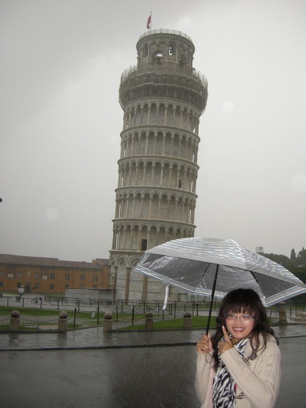 雨中的比薩斜塔也別有一番風情,感謝我們的領隊Peter認真看了氣象報告,帶我們昨天搶先登上斜塔,否則今天下雨就不能上去斜塔囉!
