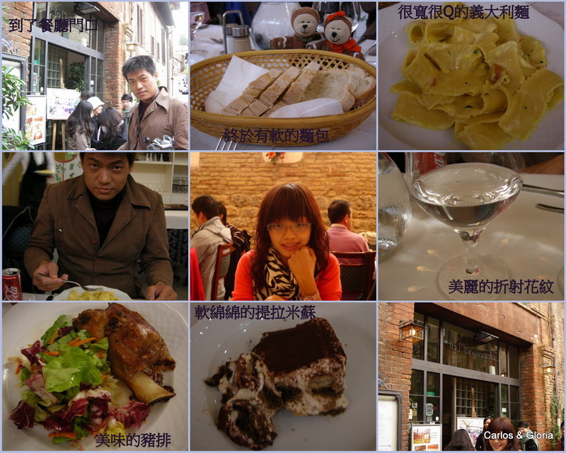 據說這天的料理是屬於托斯卡尼的地方料理,哈,非義大利人的我,當然不知道何謂托斯卡尼地方料理,但是真的非常delicious~首先今天的麵包終於是軟的啦!!!!!(感動);今天的義大利種類是很寬的麵喔,很Q很好吃哩~~~(我覺得食尚玩家把義大利的義大利麵講成沒有熟的麵太誇張了!);今天這餐深得我心,豬排煮得非常入味,我還把多的那一份吃掉了一半呢;另外義大利的提拉米蘇似乎都軟綿綿的,但是也是我的最愛!這餐的好吃指數