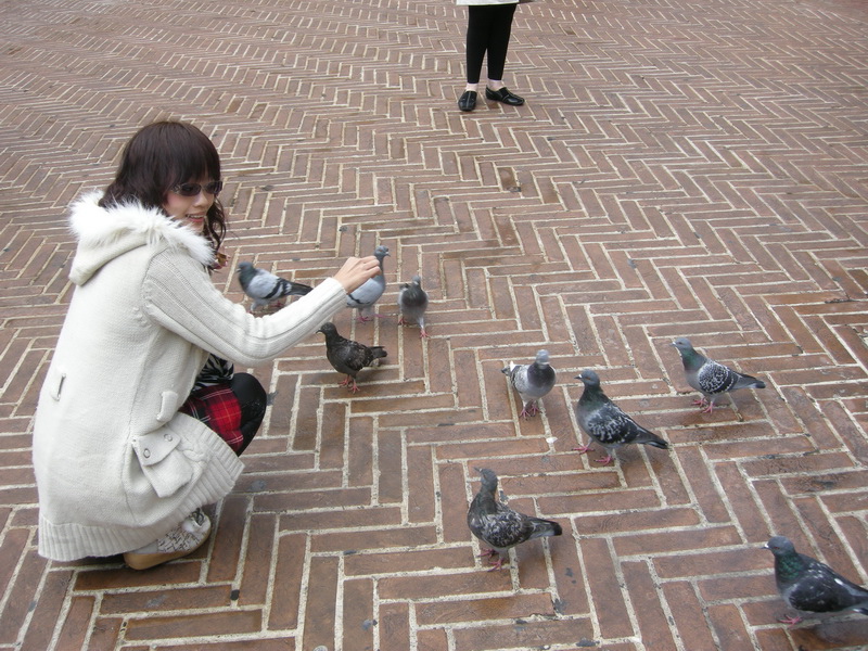 左圖:水井廣場上的建築和高塔,高塔那還有霧呢!讓這天的Sangiminano多了份朦朧的美感喔!建築物可是到現在世界上最早的銀行喔(有個更早的,但已經沒營業了!)右圖則是吃完冰淇淋後,用甜筒的碎片為一下鴿子,哈,但是Peter有告訴我們,義大利已經明文規定不可以在廣場上餵鴿子,所以體驗了一下下餵鴿子的感覺後,我們就迅速逃離現場了!